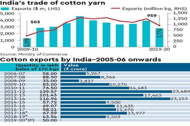 Yarn exports, however, are declining. Senior officials from the South India Mills Association (SIMA) said exports of cotton yarn reached its peak in 2013-14 (1,313.43 million kg), after which it sharply declined. During 2019-20, exports further fell to 959 million kg, primarily because of absence of incentives, which were given to the sector earlier.