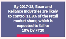 By 2017-18, Essar and Reliance Industries are likely to control 11.8% of the retail market share, which is expected to fall to 10% by FY20.