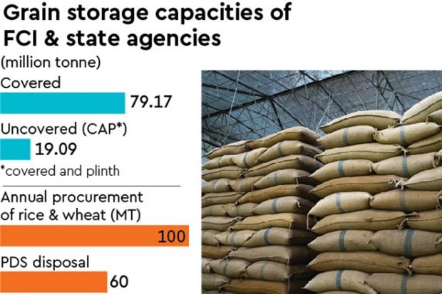 According to a senior official, out of the total grain storage facility of 98 million tonne (MT) with FCI and state government affiliated agencies, around 19 MT of wheat stocks are virtually kept in the open in the so-called covered and plinth (CAP) facilities, where the grain can’t be stored for more than six months.