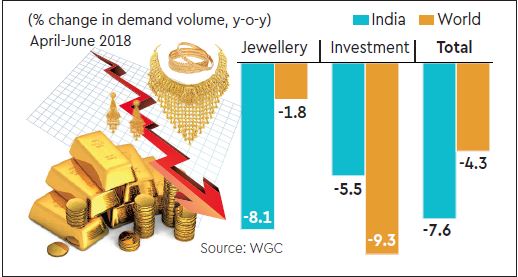 Jewellery demand during the April-June quarter declined 8.1% to 147.9 tonne, while consumption for investment was down 5.5% to 39.3 tonnes. In value terms, jewellery demand eased only 1% to Rs 41,631 crore, while investment demand rose around 2% to Rs 11,061 crore.