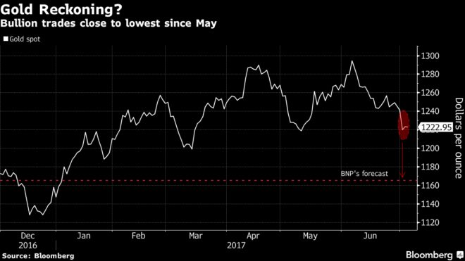 For top gold forecaster BNP Paribas SA, bullion bulls are up against a clear and present danger — the U.S. Federal Reserve. The central bank’s plan to raise interest rates again this year while potentially reducing its balance sheet is negative for the non-interest bearing asset, says Harry Tchilinguirian, the head of commodity markets strategy at BNP Paribas in London, which topped Bloomberg’s gold accuracy rankings in the second quarter. He’s among the most bearish forecasters, betting bullion will drop to $1,165 an ounce in the fourth quarter, from $1,225 on Thursday.