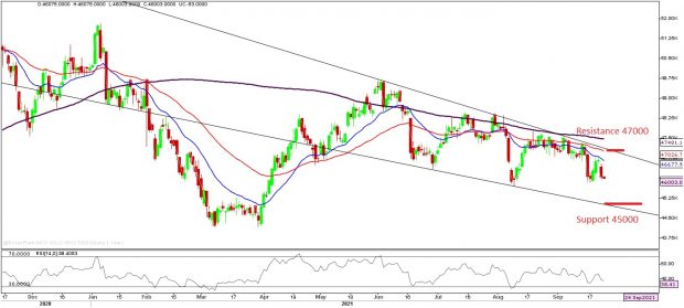 The pace of US economic growth cooled further in September after soaring in the second quarter due to labour shortages and supply constraints. Technically, gold is bearish as it is trading below $1750 at the time of writing and vulnerable to creation of fresh short positions if it bounces back to $1775. Momentum oscillator RSI_14 is still above 30 which shows gold is not in the oversold region meaning there is further room on the downside. In MCX, support is around 45500 and prices are unable to sustain above 50 day exponential moving average. We believe levels of 45000-44000 is a good opportunity to accumulate gold.