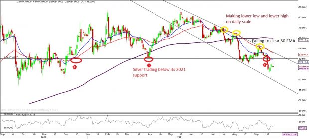 Silver meanwhile continues to struggle as it is making lower highs and lower lows on a daily scale. It is trading at a fresh 2021 low and we are still bearish in silver. Since it is near to oversold region, we are expecting technical bounce back but don’t see any creation of fresh long positions for the time being.
