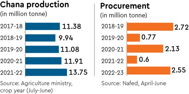 Due to a record chana production of 13.75 mt in the 2021-22 crop year (July-June), Nafed procured more than 2.5 mt of pulses variety in the 2022-23 (April-June) season under the agriculture ministry’s price support scheme (PSS), aimed at providing minimum support price (MSP) to farmers.