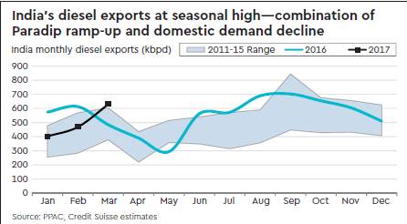 Ramp-up at both IOCL Paradip and BPCL Kochi continues to be promising, with the refineries reaching ~95/90% utilisations. Next quarter could see: (i) secondary units at these refineries ramp-up fully and (ii) HMEL’s capacity expansion coming online. Thus, we expect India’s Q2 CY17 diesel net exports to be up ~90 kbpd (20%) y-o-y. This equals a large ~10% of Asia+Middle East diesel surplus and can be a headwind for regional diesel margins near term.