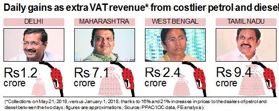 Curiously, not only the Opposition parties but even industry associations are putting pressure on the Centre, rather than states, to cut taxes on auto fuels given the recent surge in their prices (Indian basket of crude went up 12.4% between May 1 and Monday and the rupee has depreciated 2.2% against the US dollar in the period, resulting in near-corresponding increases in domestic fuel prices). Ficci said on Monday, “…there is a scope of bringing down the excise duties. While such a move will have an implication on the fiscal revenues at this juncture, there is a need to do the fine balancing act.”