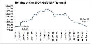Holding at the SPDR Gold ETF declined to 973 tonnes as on 31st August as compared to 1,006 tonnes as on 1st August and 975 tonnes as on 1st January 20922.