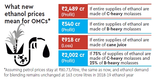 Assuming that all supplies for blending with petrol will touch 5% (or around 160 crore litres) in 2018-19, the hike in prices of the biofuel (produced out of the usual C-heavy molasses) in 2018-19 will raise the mills’ realisation by around Rs 450 crore and inflate costs of OMCs accordingly, according to some industry executives.