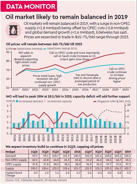 Oil markets will remain balanced in 2019, with a surge in non-OPEC supply (+1.8 mmbpd) being offset by OPEC cuts (-0.8 mmbpd) and global demand growth (+1.6 mmbpd), Edelweiss has said.