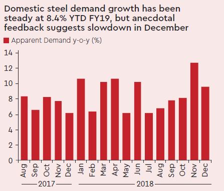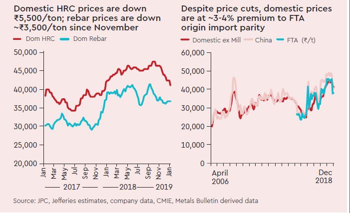 While domestic steel demand has grown 8.4% YTD Nov, rising threat of imports due to falling regional steel prices, weakening autos demand and de-stocking has led to ~11% correction in domestic HRC prices since November. Softer steel fundamentals are likely to weigh on regional and, thus, domestic prices, Jefferies has said.
