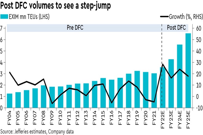 Dedicated Freight Corridor (DFC) linked 22% volume CAGR and 38% profit CAGR in FY21-25e to drive upside: Mgmt guided for 10-12% y-o-y volume growth in FY22E, excluding DFC impact. DFC commissioning to Gujarat ports is delayed to Oct 2021 from Apr 2021. We lower our FY22e volume assumption to 18% y-o-y growth at 4.4 mn TEU vs 4.7 earlier. Sharp FY22e Ebitda/EPS upgrade is driven by Rs 4.5-bn LLF vs our Rs 11 bn assumption. Disinvestment is an additional upside for Concor. Our revised PT of Rs 850 values it at 20.5x EV/Ebitda FY23e – in line with the 7-yr average, reflecting the period when DFC upside was being factored in.