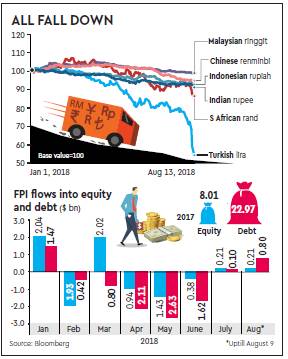 While the rupee has lost 8.7% in 2018 so far, the Chinese renminbi has depreciated by 5.5%. The movement in the currency came as a surprise since foreign flows till August 10 have been positive with foreign portfolio investors (FPIs) buying close to $900 million worth of debt and$ 407 million worth of equities.