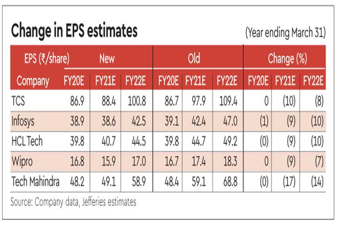 We expect sequential decline in Q1FY21e, muted Q2: Accenture’s recent guidance for 2H20 (March to August 2020) implies flat to 3.5% q-o-q decline in Q3 and stabilisation in Q420. For our coverage, we model a similar trajectory for 1HFY21e followed by slightly better than usual sequential growth in 2HFY21e given low base and pent-up demand/deferred projects.