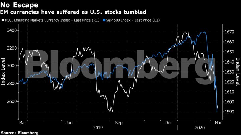 Emerging-market currencies face further sell-downs of up to 30% if the spreading coronavirus outbreak causes U.S. stocks to slide as much as they did in the global financial crisis, an analysis by Bloomberg shows.