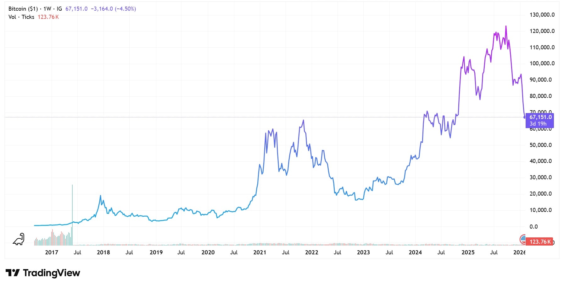 At present, Bitcoin trades at approximately $68,000, nearly 50 per cent below its most recent cycle peak of around $126,000. Similar drawdowns have occurred in previous cycles, where euphoric peaks were followed by extended and painful corrections. Past performance, of course, offers no guarantees about the future. Yet history is the only empirical guide markets provide, and all forecasts, whether bullish or bearish are ultimately rooted in historical observation. Each cycle is declared “different” in real time, but in retrospect, familiar patterns tend to reemerge.