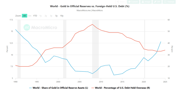 The US dollar has been depreciating at an alarming pace compared to the dollar in the last 5 years. Gold prices per ounce was 1,500$ in 2019 and right now it is close to 4,000$. It makes sense for central banks to buy more gold and sell US treasuries.