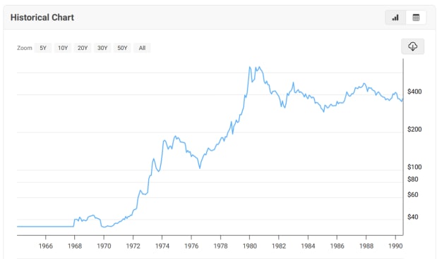Below is the price of gold after the Nixon Shock and Oil Embargo of the 70s