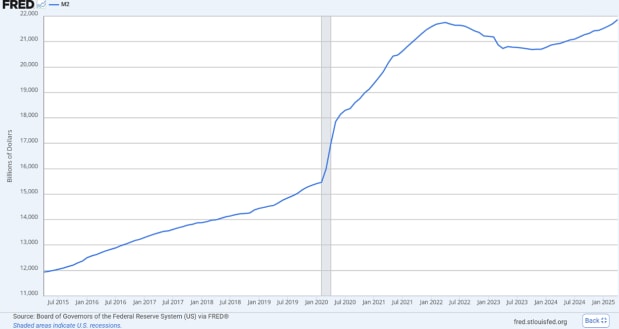 M2 money supply is a broad measure of the money supply in an economy that includes all of the components of M1 (currency in circulation and demand deposits) plus savings accounts, small-denomination time deposits, and retail money market funds. It represents not only easily spendable money but also “less liquid” money, or money that takes a bit more effort to convert into cash for immediate use. The Federal Reserve uses M2 to monitor the economy’s liquidity and to inform its monetary policy decisions, as growth in the M2 money supply can influence inflation.