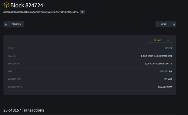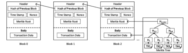 Each bitcoin block in the blockchain or the block header, besides its hash, includes a reference to the previous block’s hash, block height, timestamp, block size, transaction (Tx) count (in this case, 3157 transactions), version, bits (detailing the complexity of adding this block), nonce, and the Merkle root.