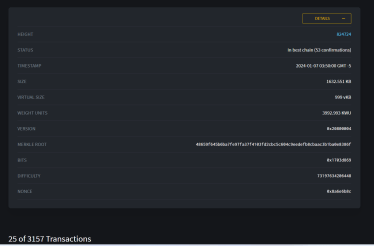 Each bitcoin block in the blockchain or the block header, besides its hash, includes a reference to the previous block’s hash, block height, timestamp, block size, transaction (Tx) count (in this case, 3157 transactions), version, bits (detailing the complexity of adding this block), nonce, and the Merkle root.