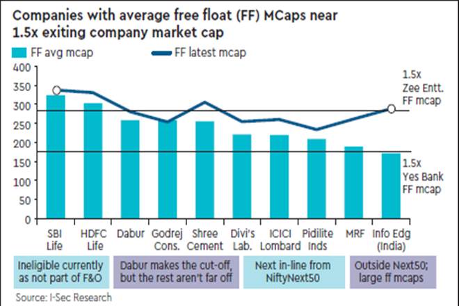 Edelweiss Securities, in an earlier note, said, “Assuming neither SBI Life and HDFC Life are included in the F&O segment nor the Nifty Inclusion eligibility criteria are revised, then the next best candidate that fits the bill for inclusion in the Nifty is either Shree Cement or Dabur (replacing Yes Bank).”