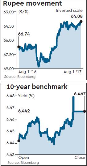 A day before RBI is scheduled to announce its third bi-monthly monetary policy for 2017-18, the rupee on Tuesday ended 10 paise higher at 64.08 to the dollar, hitting an eleven-week high. Tuesday’s level is just two paise shy of a one-year high. On May 15, 2017, the currency had closed at 64.06 to the greenback. The rupee hit a high of 64.045 during the day —11 paise short of achieving the highest intraday levels seen over the last one year at 63.93.