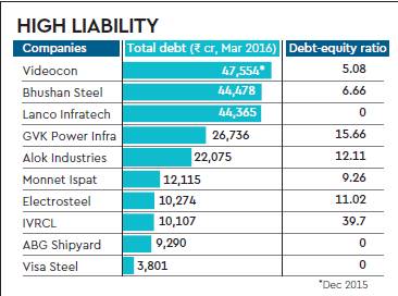 Companies such as Bhushan Steel and Lanco Infratech each owe banks close to Rs 44,500 crore. IVRCL and Electrosteel Steels are saddled with debt of over Rs 10,000 crore each, while Alok Industries has borrowed more than Rs 22,000 crore.