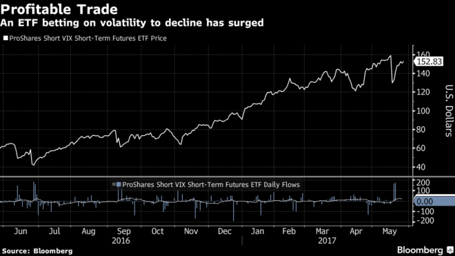 The lack of asset-price swings is partly driven by short-volatility sellers, who are emboldened by expectations of quantitative easing by central banks when any crisis arises. And unlike Argentiere, some investors are betting that volatility is likely to remain muted. As turmoil rose earlier this month, an ETF that climbs when VIX short-term futures fall received its biggest inflows since August 2015 in the five days ended May 19.