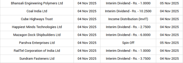 November 04: Coal India, Happiest Minds Technologies, Mazagon Dock Shipbuilders, and RailTel Corporation of India will be declaring an interim dividend for Q2.