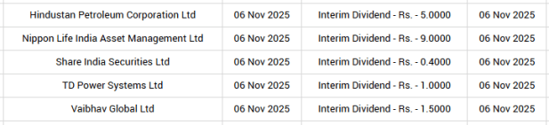 Hindustan Petroleum Corporation will trade ex-dividend on November 6. It has announced an interim dividend of Rs 5. Nippon Life India Asset Management will trade ex-dividend. The company announced an interim dividend of Rs 9.