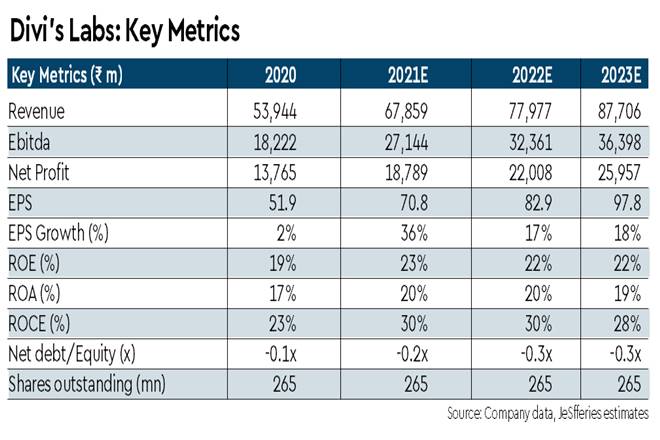 40-45% of Rs 17-bn round of capex has converted to revenues in FY21e, rest gradual: Out of Rs 17-bn capex undertaken by the company earlier, 30% has gone towards non-revenue projects. Divi’s historic asset turn of 2x should lead to an incremental Rs 24-bn revenue, out of which 40-45% has already converted to revenues, per our estimates.