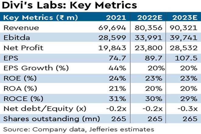 Trades expensive, downgrade to Hold: Divi’s trades at 48.4x FY23e EPS and is the most expensive Indian CDMO player; peers trade at: Syngene (44x), Gland (35.5x), Laurus (20x). Chinese peers which are expected to clock over 25% top-line growth are trading at 58x. Our FY22/23e EPS changes by -2%/-1%. We value the stock at 51.8x FY23e EPS with a PT of `5,563.