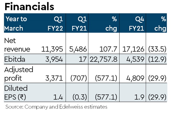 DLF’s new sales came in at Rs 10.1 bn in Q1FY22 (up 567% YoY, down 4% QoQ) despite the second wave; this was driven by healthy demand for independent floors. Rentals (DLF + DCCDL), however, slid to ~Rs 7.8 bn (~Rs 9.0 bn in Q4FY21). Cash flow remained healthy, leading to debt reduction at Devco. The company is ramping up its launch pipeline (~8.3msf target launches in FY22) keeping in mind the strong housing demand.