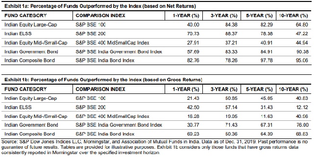 A large proportion of Indian Equity Large Cap Funds, over longer horizons, underperform their respective category benchmarks (see Exhibit 1a). Our SPIVA India Year-End 2019 research evaluates the performance of active fund managers based on net-of-fees returns (i.e., gross returns less the management fees). However, this begs the question to whether or not active fund managers fare better when evaluated based on gross returns? If we look at this research on a gross-return basis (see Exhibit 1b). One can notice that in most categories, even without the deduction of management fees, still a fairly large percentage of active funds failed to beat their benchmarks. For example, over the 10-year horizon, more than 40% of active funds in the large-cap and mid-/small-cap categories underperformed the S&P BSE 100 and S&P BSE 400 MidSmallCap Index, respectively (see Exhibit 1b). Even the government and composite bond categories had over 65% of their funds underperform their respective benchmarks based on gross returns. An investor may therefore be wary of paying a management fee in return for worse-than-benchmark fund returns even on a gross-return basis.