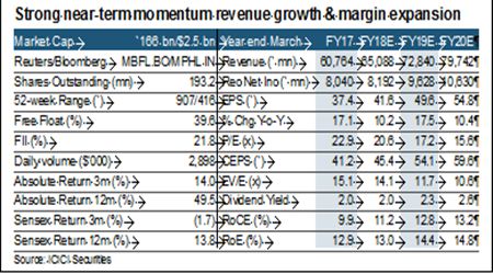 We met V. Suryanarayanan, CFO of Mphasis, for an update on the business. Commentary on business fundamentals was constructive across all dimensions of growth in the DXC and Direct Channel segments as well as for further expansion in margins. We would expect DXC and Direct Core segments to grow materially faster than the industry average in FY19 (11.5% and 14.3%, respectively) with Digital Risk revenues remaining in the quarterly range of $28 mn-$30 mn. USD revenues and INR Ebit are expected to increase by 12.2% and 20.5% in FY19. Given strong near-term momentum in deal intake, revenue growth and margin expansion, we upgrade Mphasis to Hold from Reduce.