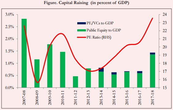 How do these magnitudes compare with the previous periods of stock market euphoria? Figure 1 illustrates total capital raised—through public and private placements—over the last decade as a percent of GDP to make the temporal comparison accurate. The red line depicts the price-earnings ratio. The green bars show that capital raising this year has picked up substantially but remains below levels reached in 2007-08, the peak of the previous boom despite the fact that the cost of capital is at similarly low levels: a price-earnings ratio of 25 implies equity costs of roughly 4 percent