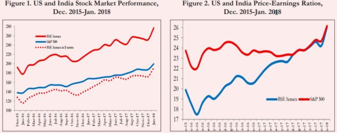 Over the past two fiscal years, the Indian stock market has soared, outperforming many other major markets. As Figure 1 shows, since end-December 2015, the S&P index has surged 45 percent, while the Sensex has surged 46 percent in rupee terms and 52 percent in dollar terms. This has led to a convergence in the price-earnings ratios of the Indian stock market to that of the US at a lofty level of about 26 (Figure 2). Yet over this period the Indian and US economies have been following different paths. So what explains the sudden convergence in stock markets?