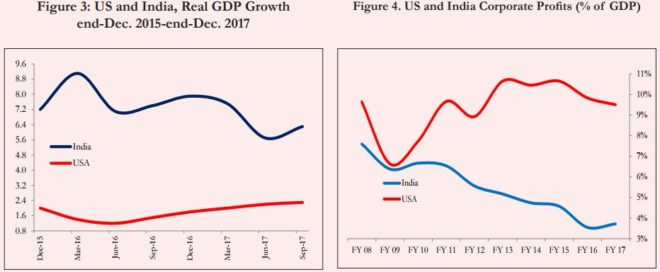 The stock market surge in India has coincided with a deceleration in economic growth, whereas US growth has accelerated (Figure 3). India’s current corporate earnings/GDP ratio has been sliding since the Global Financial Crisis, falling to just 3½ percent, while profits in the US have remained a healthy 9 percent of GDP (Figure 4). Moreover, the recently legislated tax cuts in the US are likely to increase post-tax earnings.