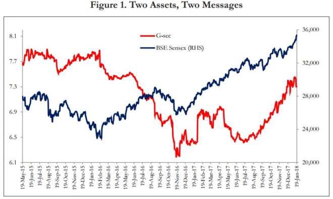 This image shows the contrast between trend between government securities and BSE Sensex from 19 May 2015 to 19 January 2018.