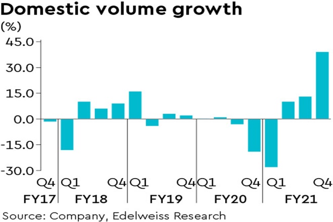 Emami’s consolidated Q4FY21 revenue (up 37.2% y-o-y) and PAT (up 190.8% y-o-y) surpassed our estimates, while Ebitda (up 65.2% y-o-y) came below estimate. Bolstered by strong performance in the healthcare portfolio, domestic volumes grew 39% y-o-y on a soft base of -19%. While two-year revenue CAGR is 6.9%, volume CAGR is 6.1%. Although mentha prices are benign, spike in other raw materials led to gross margin compression of 249bps y-o-y.