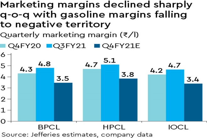 Weak OMC operating performance in Q4: With core refining remaining weak and marketing profitability falling sharply q-o-q, operating performance will show steep q-o-q decline. Reported numbers will be buoyed by inventory gains in refining. Marketing volumes and refinery thruput could be negatively impacted in Q1FY22e on renewed restrictions.