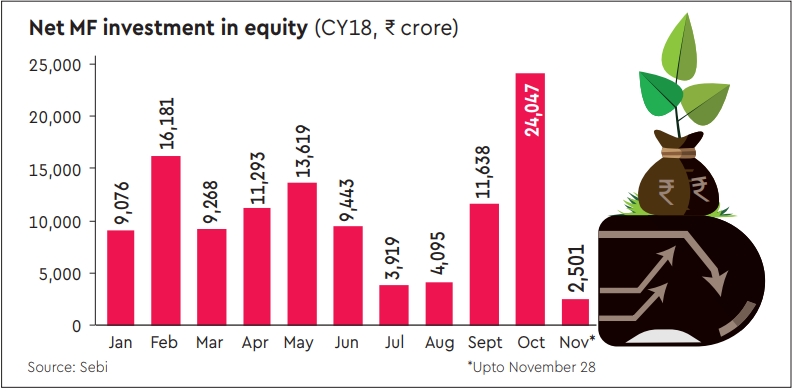 Mutual funds (MFs) have slowed their investments in equities in November even as benchmark indices have bounced back. Equity funds bought shares worth around Rs 2,500 crore up to November 28, their lowest since February 2017. MFs had invested Rs 2,039.55 crore in the equity market in February 2017, data from the Sebi showed.