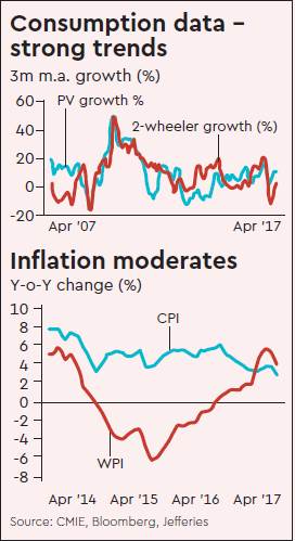 Q4 Corporate sales growth moderated to 7% (Q3: 10%) with Margins stable y-o-y. Cement data is perplexing with company data showing y-o-y growth vs 12% decline in government data. Inflation saw sharp moderation in April with WPI at 3.9% and CPI at 3%. GDP growth slowed to 2-yr low in Q417, likely a lagged trend to our Activity Index.