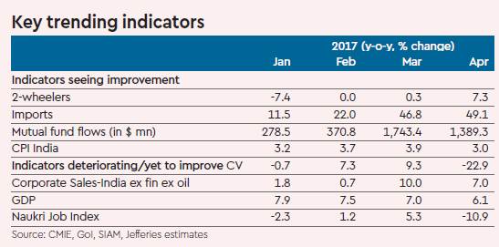 Foreign trade, autos the key positives; CV and credit the key negatives: The improvement in activity from December lows has been led by strong consumption growth and pick-up in foreign trade. Industry indicators though continue to remain weak with no indicator seeing strong growth. Foreign trade remained strong with export growth at 19% and imports at 43%.