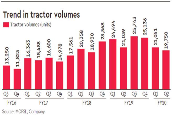 Valuation view: We upgrade our FY21e EPS by ~5% as we factor in higher tractor volumes in wake of good monsoon. The stock trades at 12.3x/10.8x FY20/21e EPS. Maintain Neutral with a TP of ~Rs 700 (~11x Sep’21 EPS).