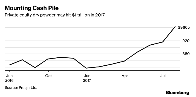 The amount of dry powder — money raised but not yet invested — could hit $1 trillion by the end of year in private equity alone, after reaching $963 billion in July, according to researcher Preqin Ltd. That’s pushing out the average time it takes for new commitments to start being invested to as long as three years, up from one year previously, according to State Street.