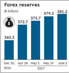 Foreign exchange reserves grew by $2.4 billion from the previous week to touch a life-time high of $381.2 billion as on June 2, data from the Reserve Bank of India showed on Friday. Reserves have grown 5.8% since the beginning of the year, and have touched record levels four times since April, on the back of aggressive dollar buying by the RBI. Prior to June 2, reserves hit a record high of $379.3 billion as on May 19, an all-time high of $375.7 billion as on May 5 and a life-time high of $372.7 billion as on April 28. The central bank has been buying dollars on a daily basis, both in the spot market as well as in the forward market, to limit the appreciation of the local currency, which has been gaining steadily since the beginning of the year, traders said. “Their intention is to shore up the reserves as well as to prevent a sharp appreciation in the rupee. The exporters will panic and their competitiveness will dip if the rupee jumps suddenly. Obviously, the RBI does not want that to happen,” a foreign exchange trader with a private-sector bank said. Since the beginning of the year, the rupee has gained 5.9% against the dollar. On Friday,it closed at 64.24 against the dollar.Among other factors, strong demand for the local currency from foreign portfolio investors (FPIs) looking to invest in Indian assets has caused the rupee to appreciate. FPIs have bought Indian shares and bonds worth around $20.17 billion so far in 2017. Given India’s low current account and fiscal deficits, and the advantage it offers in terms of interest rate differential, traders expect the inflows to continue in the near-term. Foreign currency assets (FCAs), the largest component of the foreign exchange reserves, grew to $357.3 billion from $354.5 billion in the previous week, RBI data showed.
