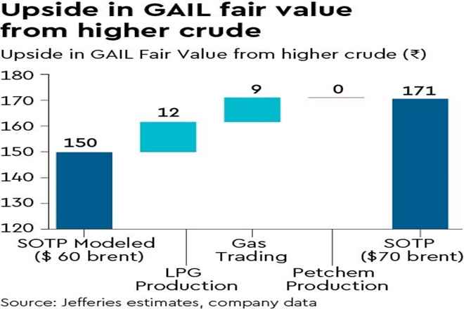 SOTP rises Rs 20/share for every $10 rise in average crude price: Our fair value estimate increases 14% applying the same multiples that we use in our base case to value the enhanced nat gas trading and LPG business profits. Our Fair Value estimates at $70 is Rs 170 and at $80 is Rs 193.