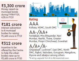 It was only last year that urban local bodies (ULBs) started tapping the bond market in a meaningful manner and the process is going to gather further momentum in the current fiscal. Thanks to their improved credit profiles, which are in part attributable to direct transfer of funds by the Centre and more efficient revenue-generating measures, as many as 29 ULBs with ratings of A and above are firming up plans to raise close to Rs 6,000 crore via bonds in FY20-FY21 period.