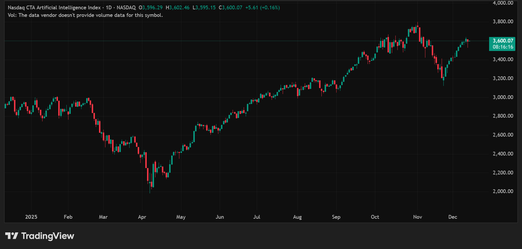 A lot of this optimism is already built into the stock prices of the AI stocks. Here is a one year chart of the NASDAQ CTA AI Index clearly reflecting that.